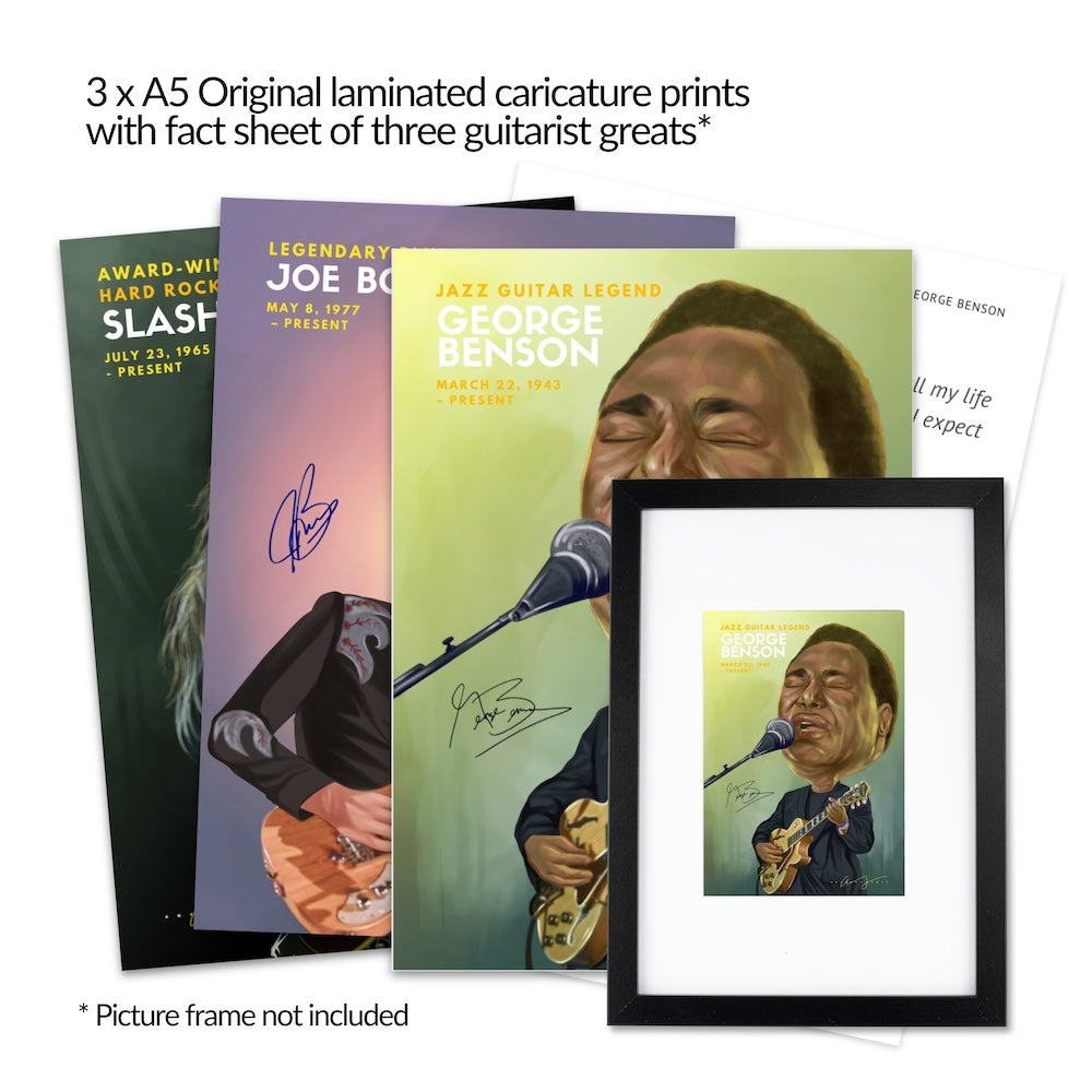 Your selection includes a Geepins enamel guitar pin brooch (choose from eighteen different options), a Pick Geek Jazzy guitar pick set, a 2-pack Pick Geek microfibre polish cloth set, plus 3 x A5 original laminated caricature prints of 3 legendary guitarists with summary details on the reverse side, and 3 x A5 gloss laminated guitar chord and scales charts.
