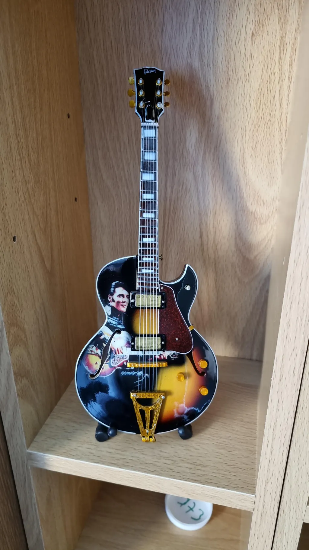 Introducing Axe Legends' miniature Gibson ES-175 replica guitar, famously played by Elvis Presley. These Axe Legends mini guitars make the perfect gift for a beloved friend, a token of appreciation for Dad, or a special treat for yourself. Each guitar mini is meticulously crafted with exquisite attention to detail, embodying the spirit of legendary guitarists.