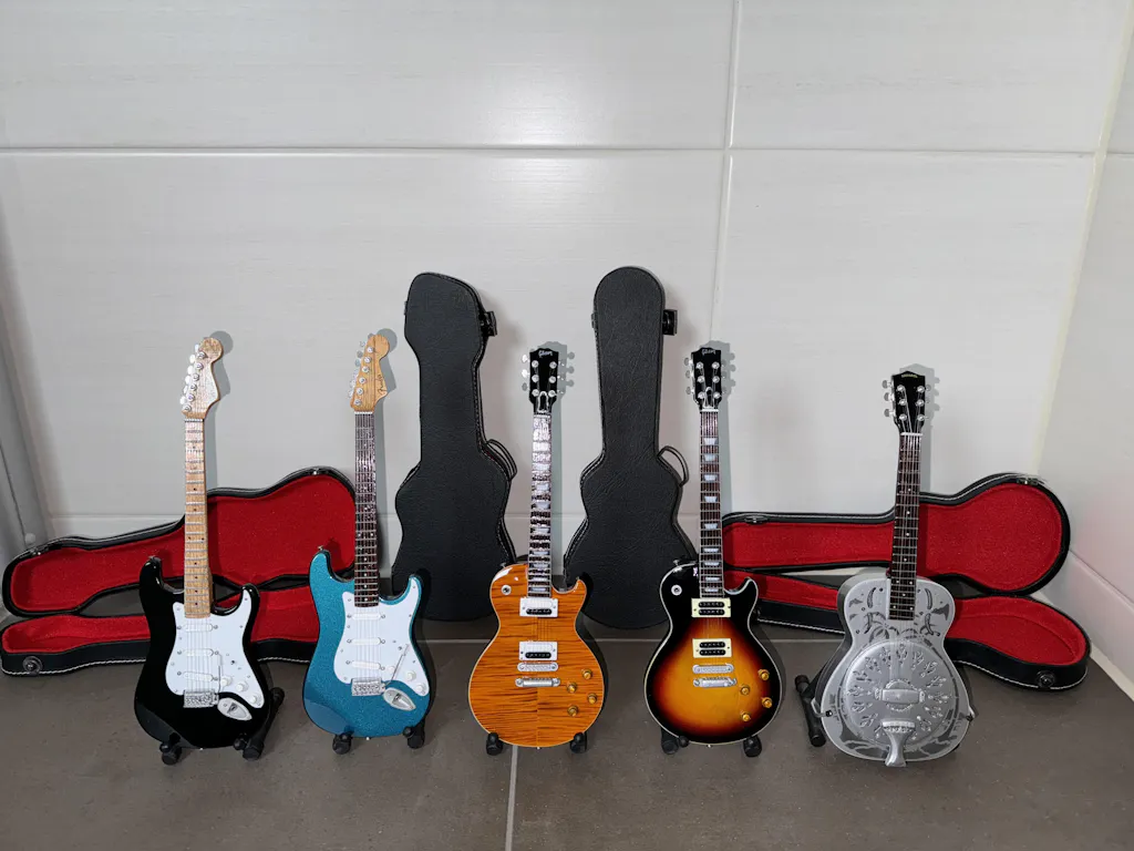 This handcrafted, unlicensed miniature guitar is meant solely for display, not for playing. It features the names of renowned artists purely for illustrative purposes, showcasing the unique style of each guitar. While not exact replicas in terms of proportions, sizes, or design, they are expertly crafted to capture their essence.